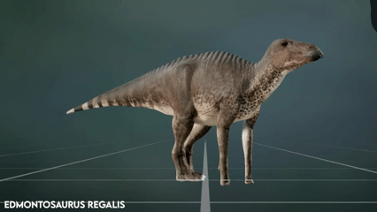 Edmontosaurus is one of the largest of all the hadrosaurus growing to up to 14 meters long standing at a resting height of 12 feet and weighing an average of 5½ metric tons. With some exceptionally large but fragmentary individuals almost reaching 50 feet long It’s size was it’s greatest strength being so large it could use it’s size and weight to defend itself from predators. And by Predators I mean Tyrannosaurus with fossil evidence supporting Tyrannosaurus hunting Edmontosaurus. It defended itself by standing on its hind legs for intimidation or running away at up to 30 miles per hour. Edmontosaurus were social animals living in large herds and migrating in search of food, doing so for safety in numbers and to protect their offspring. A relative of Edmontosaurus, Maisaura laid eggs in clutches of 16, given that Edmontosaurus was larger it likely laid 20-25 eggs. Which would give birth to tiny babies that would stick closely to their mothers until mature at around __ years. Most however would not make it to adulthood. Of it’s two species E. Regalis has a small rounded crest on the top of it’s head while E. annectens is crestless. Regalis is also less common and older than annectens about 9 million years older and only found in the Horseshoe canyon formation. Edmontosaurus lived with many iconic dinosaurs like Anzu, Ankylosaurus, Pachycephalosaurus, Triceratops, and Struthiomimus. Edmontosaurus went extinct at the K-PG mass extinction as the meteor landed clouding the skies with smoke, Edmontosaurus food supply disappeared and because of it’s large size it could not feed itself.