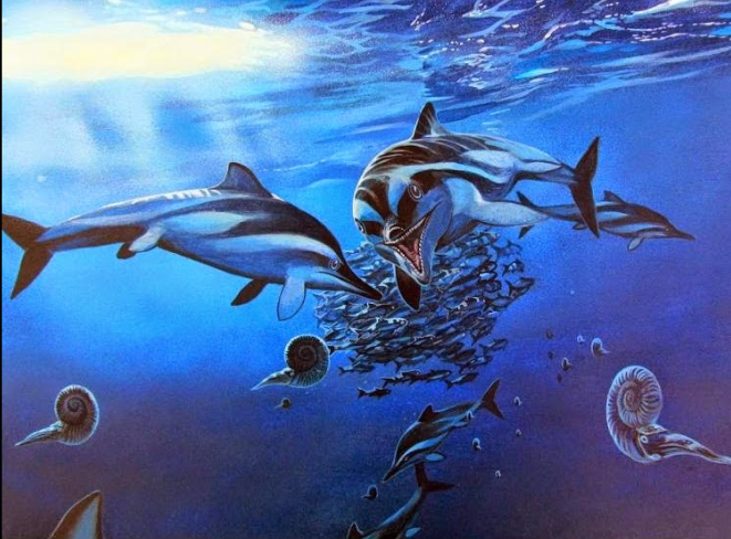 Ichthyosaurus is the Head member of the ichthyosaur group. These animals are the mesozoic equivalent to dolphins with long teethed snouts and powerful flukes dorsal and pectoral fins. Ithchyosaurus grew to almost 3 meters long and weighed around 200 pounds. A relative of Ichthyosaurus Opthalmosaurus has the largest eye to body ratio of any vertebrae. Allowing Ichthyosaurs to quickly see movement and see better in low depths and night. Icthyosaurs gave live birth with the pup coming out face first and rushing to the surface to take it’s first breath of air. Ichthyosaurus mainly hunted fish and squid