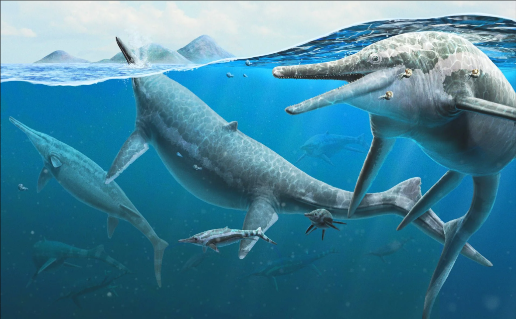 Commonly referred to as a sea blimp, Shonisaurus popularis was one of the largest Ichthyosaurs. Growing up to 44-49 ft long and weighing up to 23-32 short tons. Shonisaurus lived in the Panthalassic Ocean, which was the Pacific Ocean in the Late Triassic. Its skull was 9 ft long, mostly due to its long, narrow snout. It had ___ teeth indicating it did not eat hard bodied animals preferring soft bodied animals like cephalopods. I imagine Shonisaurus would have parasitic barnacles over its body like many whales do. I also imagine they took care of their offspring just like whales do, since their offspring would be vulnerable without protection. Unlike most reptiles, they were viviparous, giving live birth rather than laying eggs. Young Shonisaurus had teeth. Shonisaurus went extinct in the Triassic-Jurassic (Tr-J) extinction