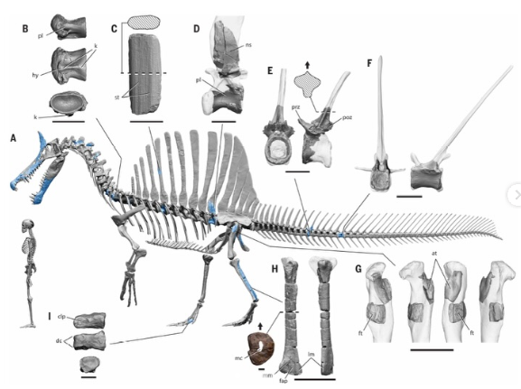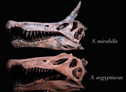 Spinosaurus Mirabilis As of 2026 there has been a Second species of Spinosaurus described. Most strikingly about it, is it's giant Schimitar shaped crest on the top of it's head which was jarring and would have been used in attracting mates. There is hardly any post cranial skeleton to go off of but from the material it can be determined that S. Mirabilis had proportionally longer legs than S. aegypaticus as well as a more slender snout. From the material it's presumed to be around 8 meters long however it likely wasn't done growing and would been larger at maturity.